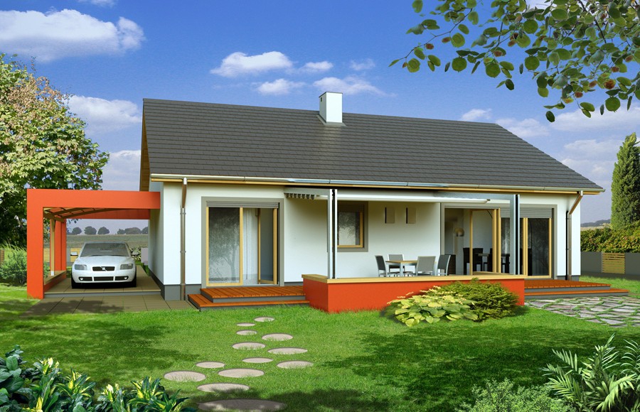 Albert - przytulny parterowy dom dla 3-4 osobowej rodziny. Albert 2 -wersja z poddaszem użytkowym (kąt nachylenia dachu 33o), posiada dodatkowe dwa pokoje i łazienkę i jest przeznaczona dla 3-6 mieszkańców. Prosta, dwuspadowa konstrukcja dachu i stropu oraz optymalne wykorzystanie przestrzeni ewentualnego poddasza wpływa na optymalizację kosztu uzyskania powierzchni użytkowej w budynku. Duże przeszklenia drzwi tarasowych z części dziennej i sypialni, mocno integrują dom z ogrodem i jednocześnie zwiększają przestronność wnętrza. Projekt Abert i Albert 2 występują w wariantach: bez wykusza w jadalni (A), z wykuszem (B), a każdy z nich może mieć wiatę na auto lub nie.
