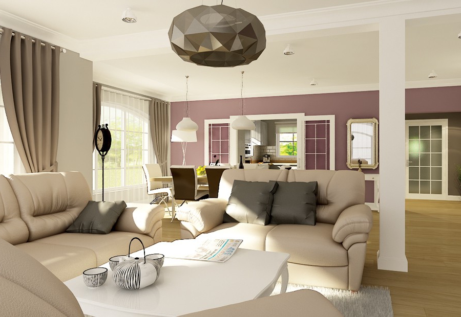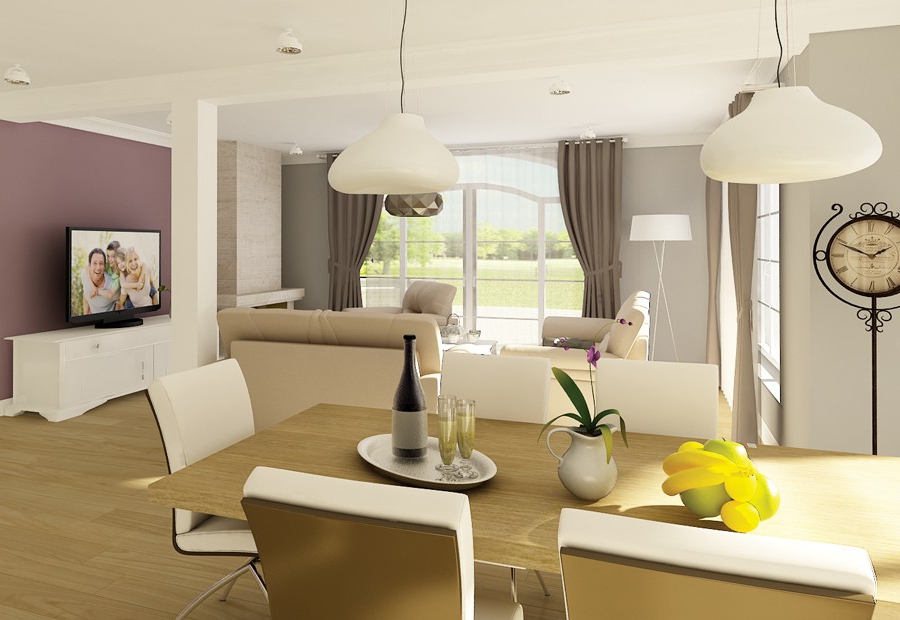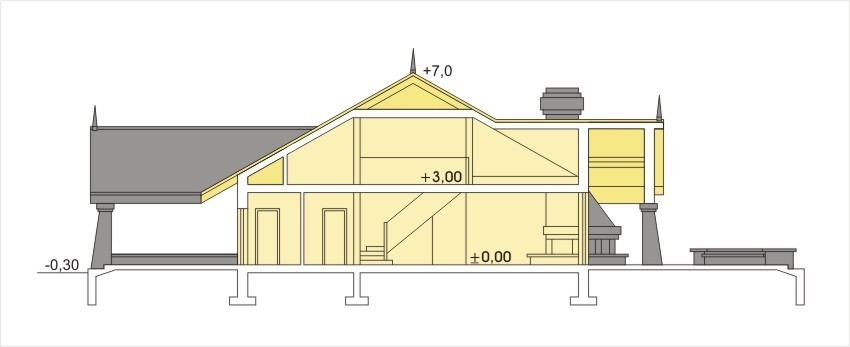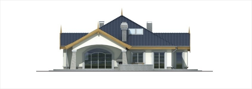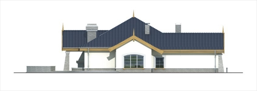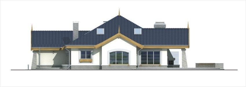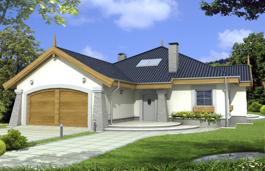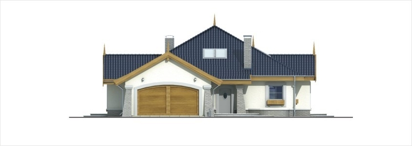 Przytulny, nieduży, nieco bajkowy dom, przeznaczony dla 4, 5, a wypadku adaptacji poddasza nawet 7 osobowej rodziny. Otwarta przestrzeń pokoju dziennego i kuchni, wydzielona część sypialna pozwalają na komfort i intymność. Kształt dużego zadaszonego tarasu można dowolnie zmieniać. Podcień z zewnętrznym kominkiem pozwala urządzać towarzyskie spotkania w ogrodzie, nie tylko w pełnym słońcu. Całość uzupełnia dwustanowiskowy garaż i pomieszczenie gospodarcze. Ewentualne poddasze można zaaranżować dowolnie również w późniejszym etapie.