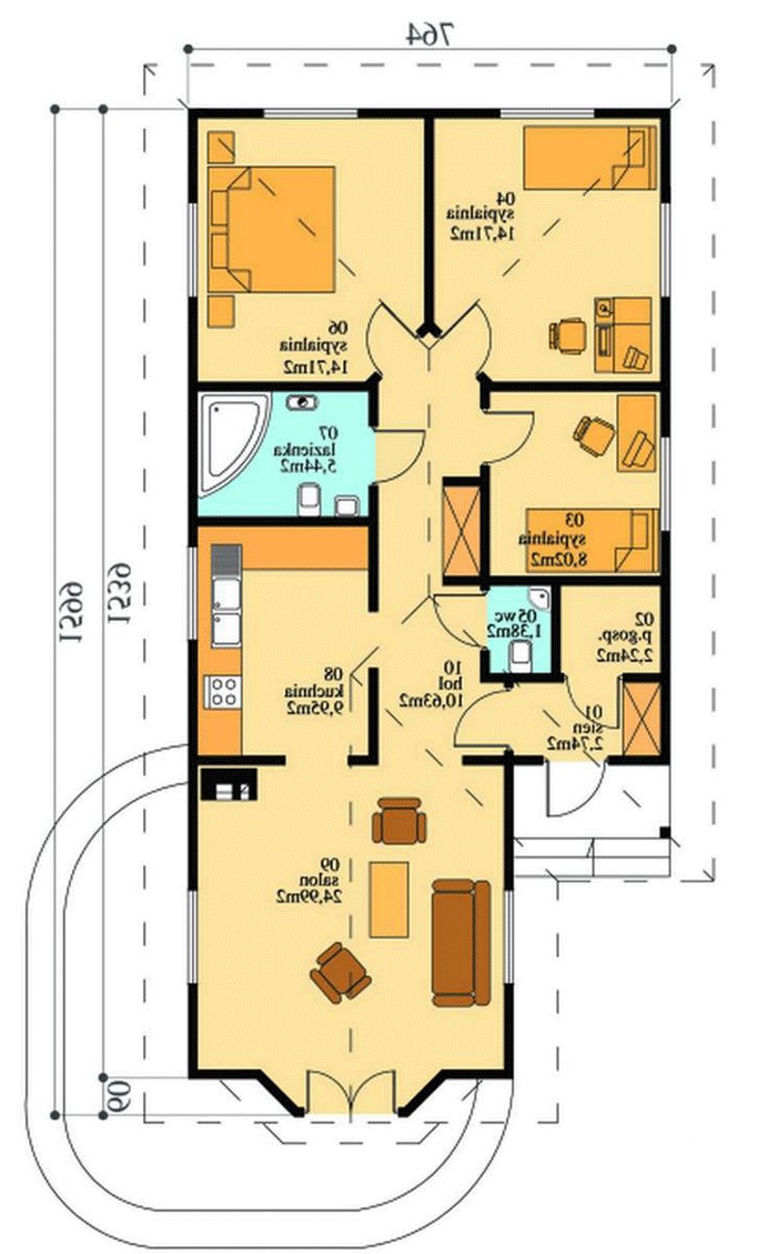 Dom parterowy z użytkowym poddaszem, niepodpiwniczony. Dom podzielony jest na dwie strefy dzienną i nocną. Strefa dzienna na parterze to hol, kuchnia, pokój, pokój dzienny z kominkiem, pomieszczenie gospodarcze i wc natomiast strefa nocna to trzy sypialnie z łazienką i garderobą. Dach dwuspadowy o kącie nachylania 45 stopni kryty dachówką blaszaną. Prosta bryła budynku,łatwa w budowie. Wygodny budynek dla cztero-pięcio osobowej rodziny. Lokalizacja budynku na działce w dwóch wariantach w zależności od usytuowania budynku do ulicy. Projekt budynku w lustrzanym odbiciu - 129 DP