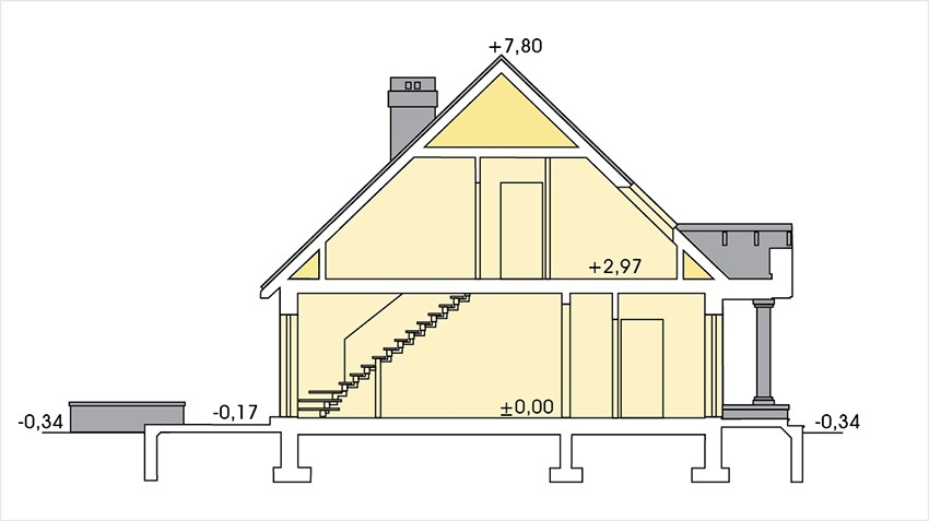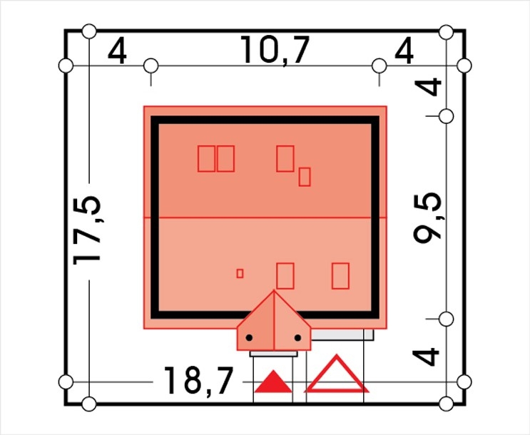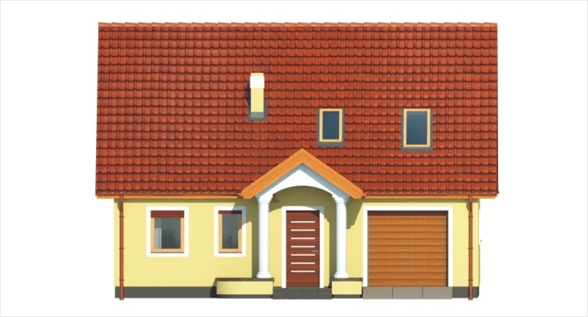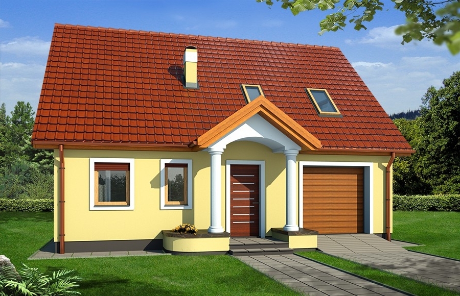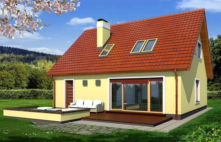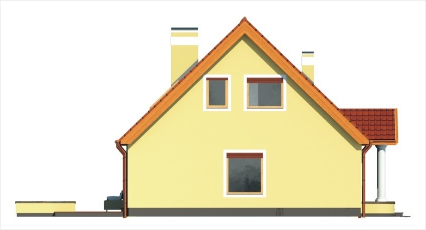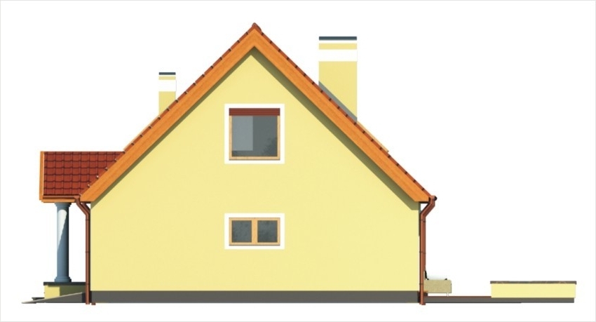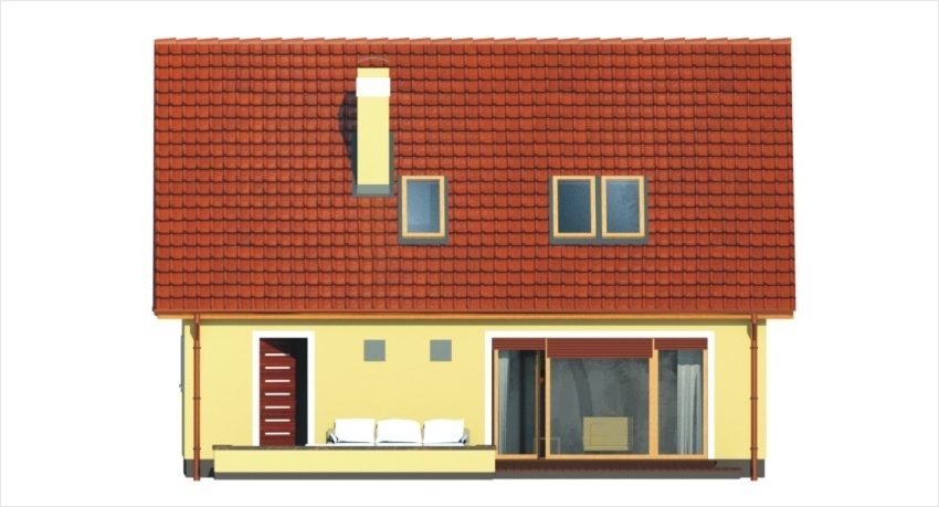 Sonia - nieduży, przytulny piętrowy dom dla 3-4 osobowej rodziny, z wbudowanym garażem, z możliwością dobudowy wiaty na drugie auto. Mimo niewielkich gabarytów, dom oferuje stosunkowo dużą przestrzeń mieszkalną dzięki połączeniu pokoju dziennego z jadalnią. Zastosowanie dużych przeszkleń drzwi tarasowych integruje dom z ogrodem i sprzyja wspólnemu spędzaniu czasu mieszkańców. Prosta, dwuspadowa konstrukcja dachu i stropu oraz optymalne wykorzystanie przestrzeni poddasza wpływa na obniżenie kosztu uzyskania powierzchni użytkowej w budynku. Kominek i piec w kotłowni obsługiwane są jednym kominem, a z racji ich bliskiej odległości od siebie, uzasadnione jest zastosowanie kominka z płaszczem wodnym do wspomagania pieca c.o. Można powiększyć jadalnię o wykusz, który jest jednocześnie tarasem dostępnym z pokoju na piętrze (Sonia B).