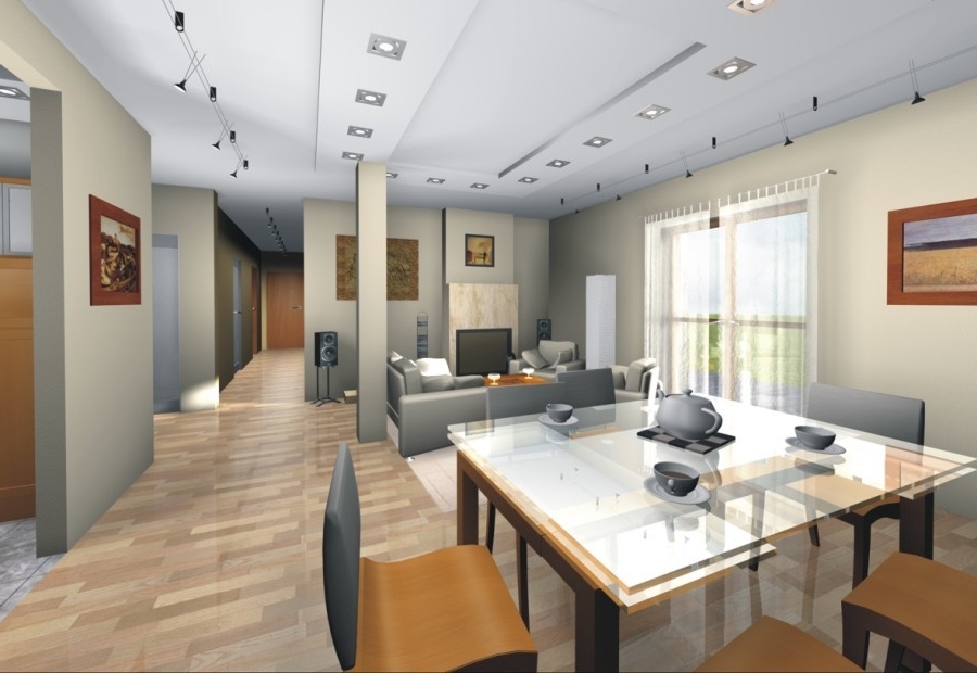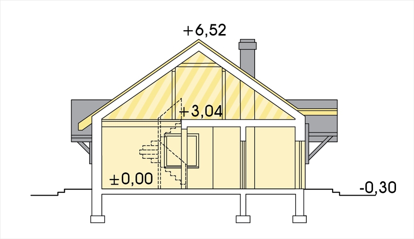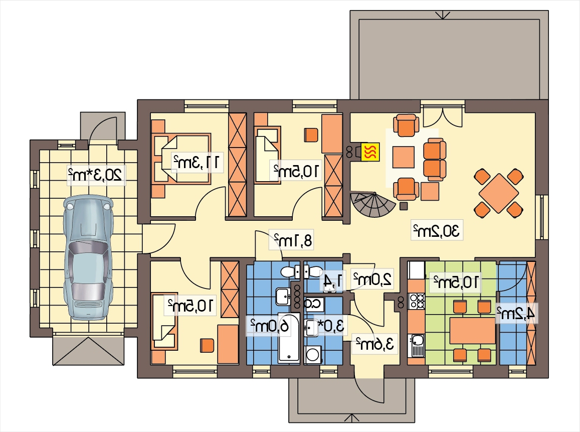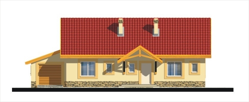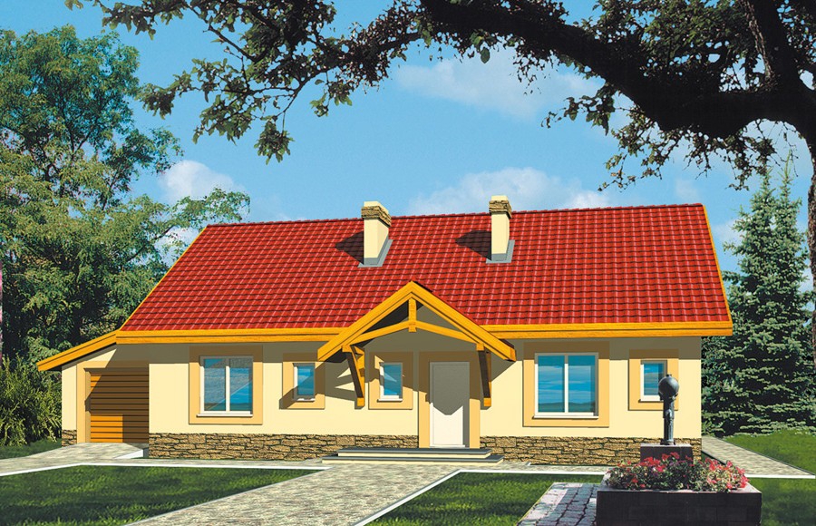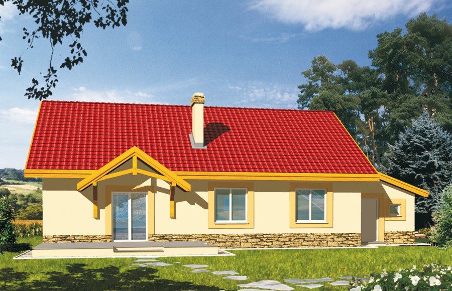 Elegancki i skromny dom parterowy, niepodpiwniczony. Zaletą tego projektu jest czytelny i praktyczny układ wnętrza z wyraźnym podziałem na strefę dzienną i nocną. Nieużytkowe poddasze o kącie nachylenia 35° nadaje się do adaptacji. W jej wyniku można uzyskać dodatkowo 40 m2 powierzchni o wysokości min. 180 cm. Prosta konstrukcja tego domu wpływa w istotny sposób na łatwość wykonania i tym samym na rzeczywisty koszt realizacji. Projekt ma warianty: ze stropem drewnianym (wersje A, B i E) i ze stropem Teriva (wersje C, D i F).