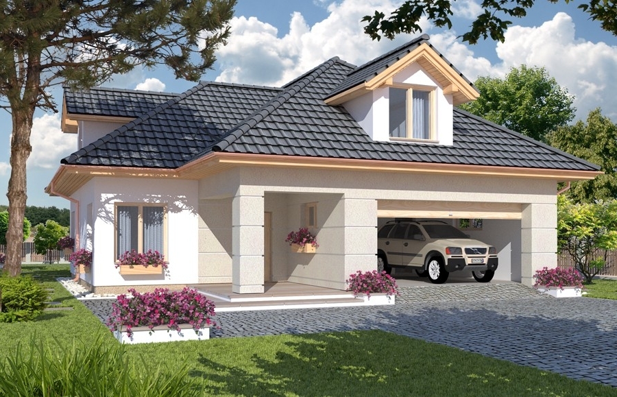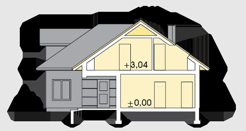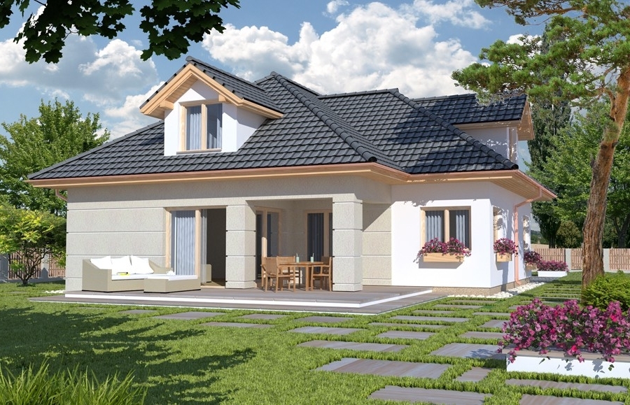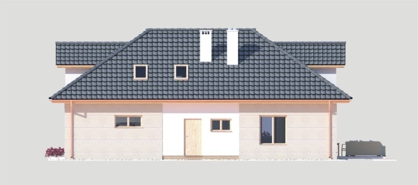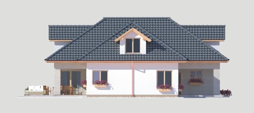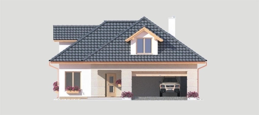 Bardzo wygodny i funkcjonalny dom o harmonijnych proporcjach utrzymany w ponadczasowej, eleganckiej stylistyce. Na parterze znajdują się przenikające się pomieszczenia kuchni, jadalni i pokoju dziennego wychodzące na częściowo zadaszony taras. Kuchnia dzięki swemu otwarciu na jadalnię może zostać zaaranżowana jako kuchnia z wyspą kuchenną. Na parterze znajduje się jeszcze dodatkowy pokój, a z garażu dostępne jest pomieszczenie kotłowni i spiżarni Na piętrze znajdują się trzy wygodne sypialnie, łazienka i pomieszczenie pralni - suszarni. Ścianka kolankowa ma wysokość 57cm, ale dla wygody użytkowania pseudo ścianka kolankowa umieszczona jest na poziomie 100cm. Projekt dostępny w wersji z kotłem na gaz oraz na paliwo stałe.