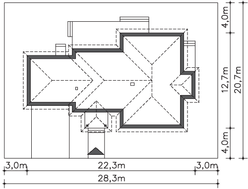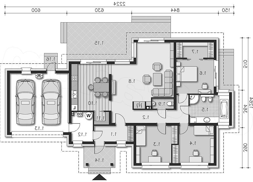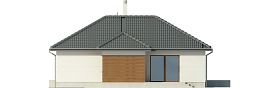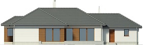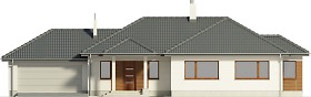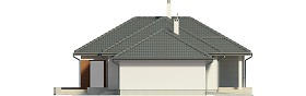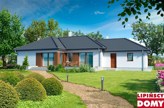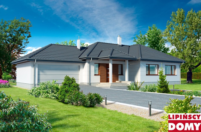 Rozłożysty energooszczędny bungalow z efektownym wielospadowym dachem, podkreślającym nowoczesny charakter. Z pewnością jest to propozycja dla osób ceniących sobie trochę nietypowe, ale funkcjonalne rozwiązania. Centralnie usytuowany jasny salon z kominkiem jest sercem domu. Obok, częściowo oddzielona ścianką telewizyjną, przewidziana jest duża kuchnia ze stołem jadalnym i  spiżarnią. Dom mieści w sobie również wygodne trzy sypialnie oraz przepiękną oryginalnie doświetloną łazienkę z dużą wanną. Wygody dopełnia spore pomieszczenie gospodarcze, które łączy dom z  dwustanowiskowym garażem.