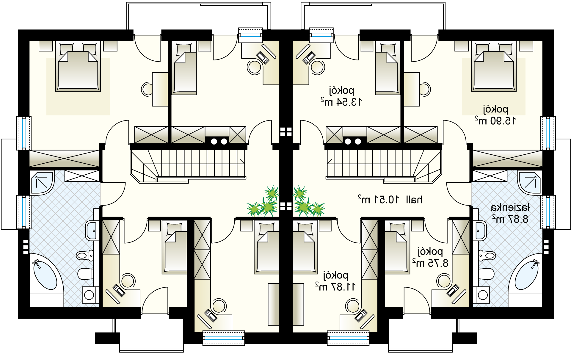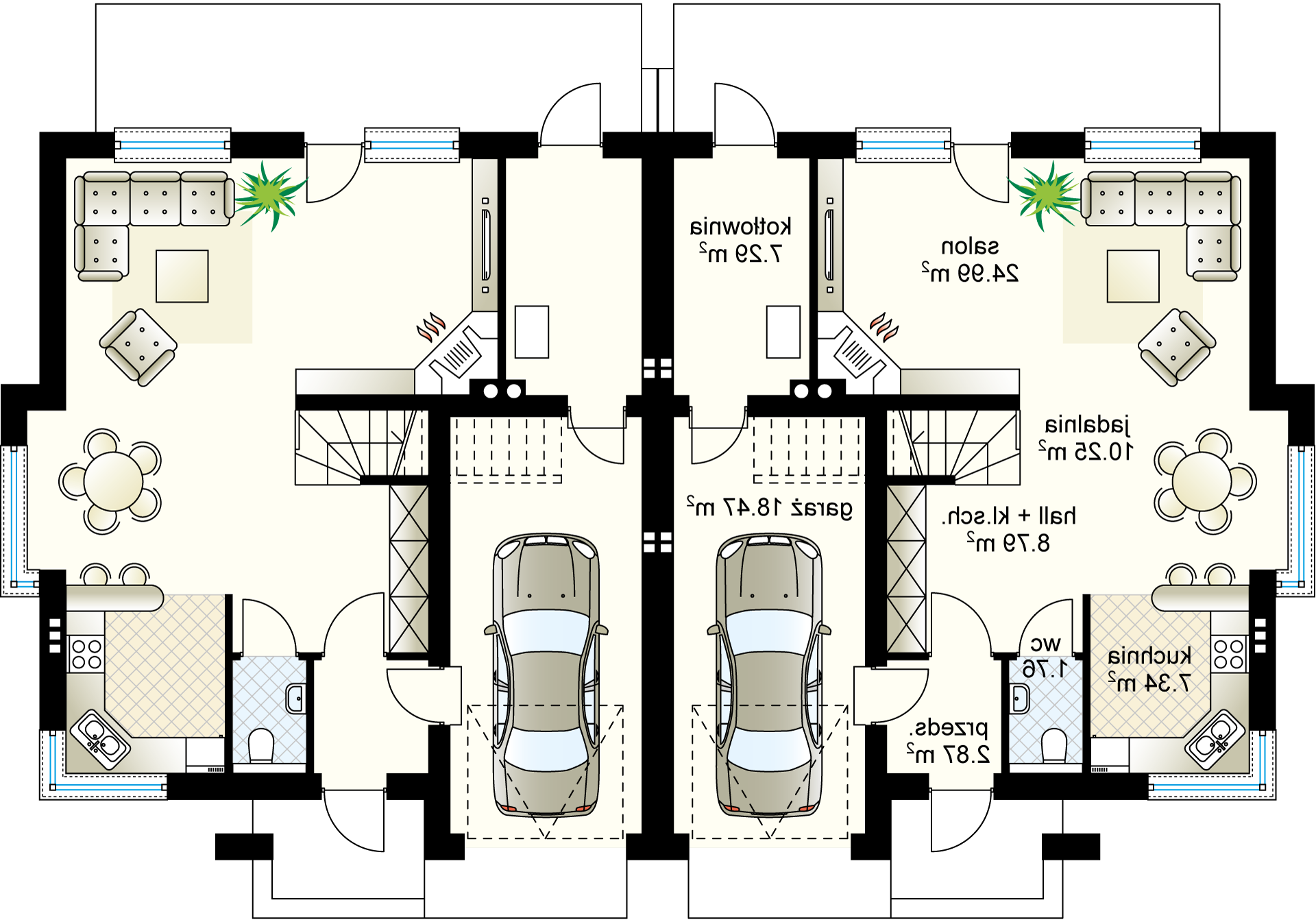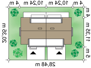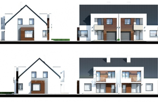 Projekt domu przeznaczony do zabudowy bliźniaczej z garażem jednostanowiskowym. Najkrócej można o nim powiedzieć: mały dom z dużym wnętrzem. Nie odczuwa się w nim ciasnoty typowej dla szeregówek. Na parterze zwraca uwagę duży hall i przedsionek z przejściem do garażu. Na poddaszu zaś cztery wygodne pokoje. Prosta bryła i dach służą obniżeniu kosztów budowy i eksploatacji.