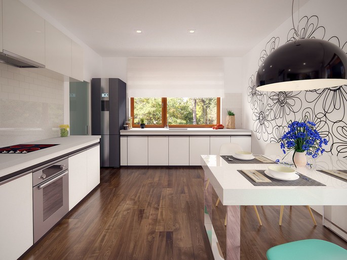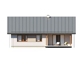 Nieduży jednorodzinny budynek mieszkalny, parterowy, niepodpiwniczony z jednostanowiskowym garażem. Funkcjonalny układ pomieszczeń zapewnia optymalny komfort 3-osobowej rodzinie. Ergonomicznie zaprojektowana przestrzeń została wyraźnie podzielona na część dzienną, nocną i gospodarczą. Część reprezentacyjna domu, to przestronny salon połączony z jadalnią, który otwiera się na duży, zadaszony taras oraz kuchnia ze spiżarnią. Oprócz części dziennej, przewidziano strefę intymną domu, która składa się z dwóch sypialni i łazienki. Dużą kotłownię oraz garaż zaprojektowano w części gospodarczej domu. Ciekawie zaprojektowaną wnękę w garażu można wykorzystać jako skład opału bądź pomieszczenie gospodarcze. Geometria rzutu oraz prostota bryły czynią ten dom tanim i prostym w budowie oraz niedrogim w utrzymaniu i eksploatacji.