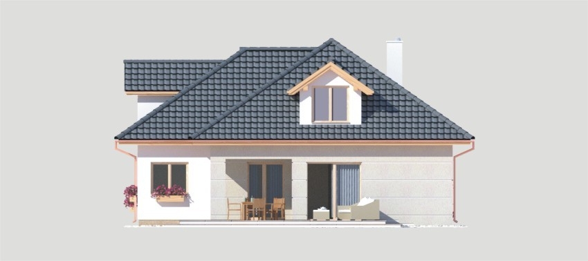 Bardzo wygodny i funkcjonalny dom o harmonijnych proporcjach utrzymany w ponadczasowej, eleganckiej stylistyce. Na parterze znajdują się przenikające się pomieszczenia kuchni, jadalni i pokoju dziennego wychodzące na częściowo zadaszony taras. Kuchnia dzięki swemu otwarciu na jadalnię może zostać zaaranżowana jako kuchnia z wyspą kuchenną. Na parterze znajduje się jeszcze dodatkowy pokój, a z garażu dostępne jest pomieszczenie kotłowni i spiżarni Na piętrze znajdują się trzy wygodne sypialnie, łazienka i pomieszczenie pralni - suszarni. Ścianka kolankowa ma wysokość 57cm, ale dla wygody użytkowania pseudo ścianka kolankowa umieszczona jest na poziomie 100cm. Projekt dostępny w wersji z kotłem na gaz oraz na paliwo stałe.