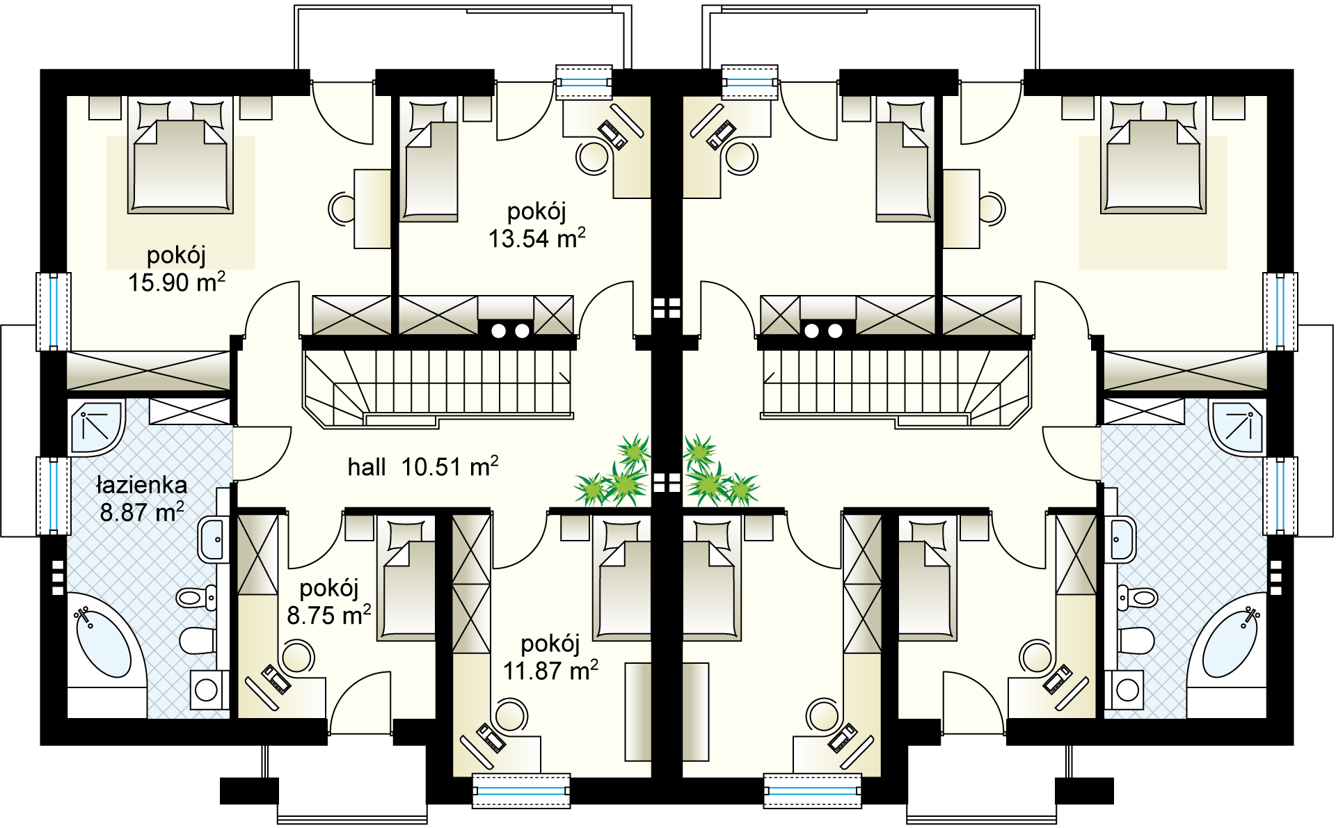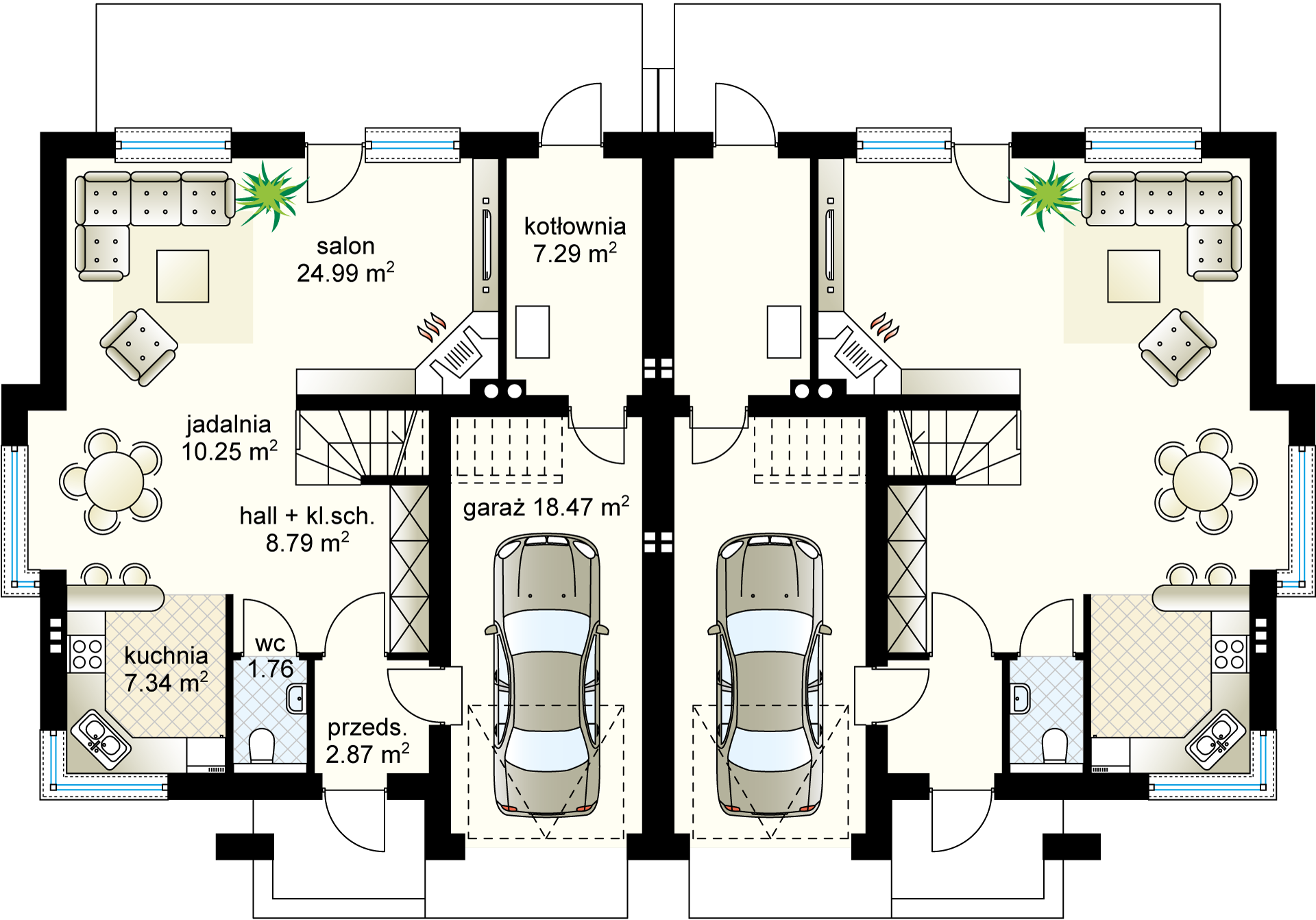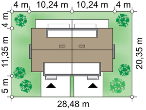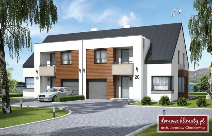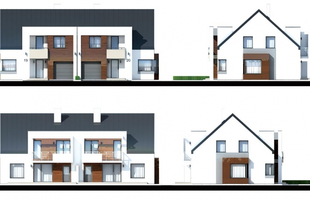 Projekt domu przeznaczony do zabudowy bliźniaczej z garażem jednostanowiskowym. Najkrócej można o nim powiedzieć: mały dom z dużym wnętrzem. Nie odczuwa się w nim ciasnoty typowej dla szeregówek. Na parterze zwraca uwagę duży hall i przedsionek z przejściem do garażu. Na poddaszu zaś cztery wygodne pokoje. Prosta bryła i dach służą obniżeniu kosztów budowy i eksploatacji.