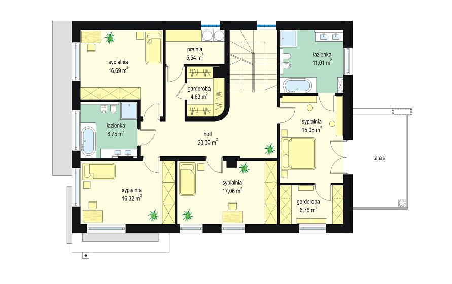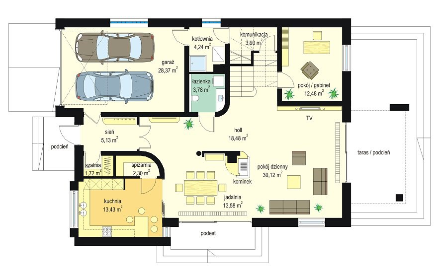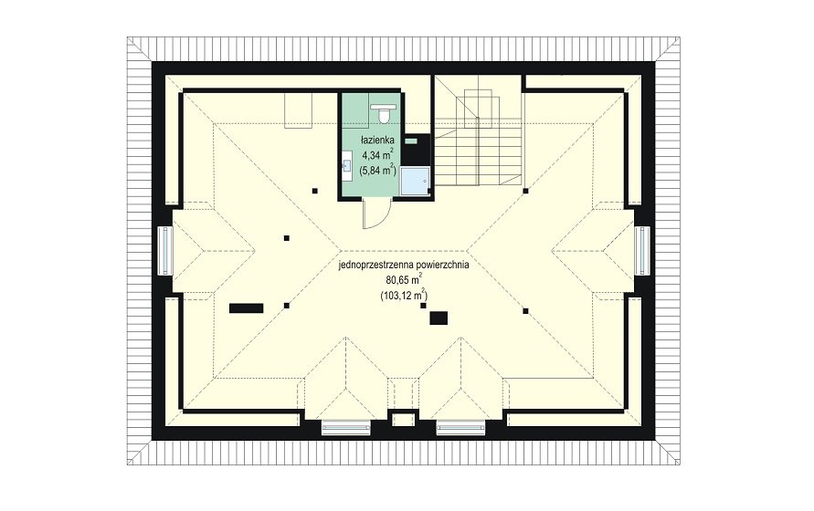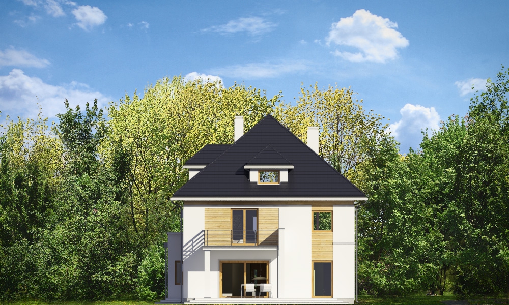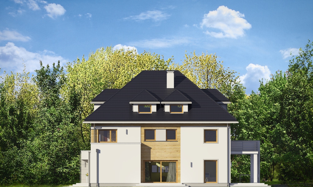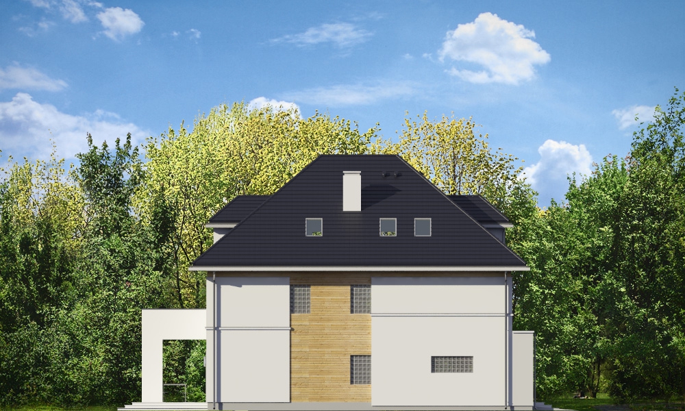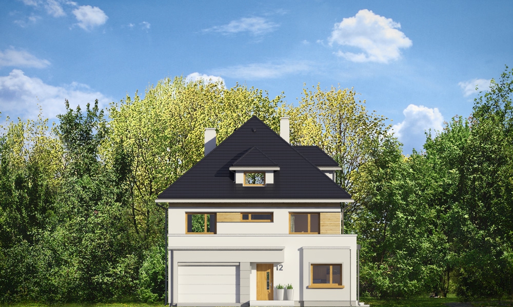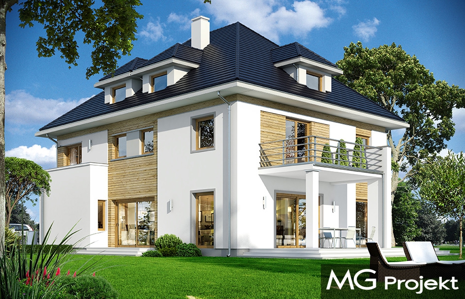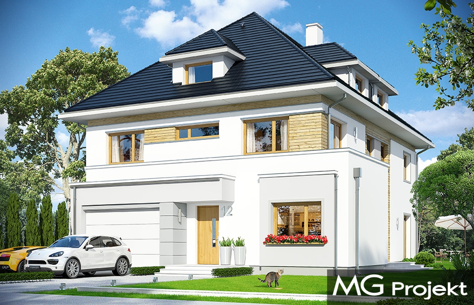 Agat 2 jest nową wersją naszego projektu Agat, tym razem w nowocześniejszej stylistyce, dostosowanej do miejskiej zabudowy na dość wąskiej i niedużej parceli. Często dysponując niedużym placem Inwestorzy chcą zbudować spory dom z dużą ilością pomieszczeń. Nie ma wówczas innego wyjścia jak iść „w górę”, zwiększając wysokość domu i ilość kondygnacji. Agat 2 to doskonała propozycja dla tego rodzaju zabudowy. Dom ma zwartą sylwetkę, zaplanowaną na prostokątnym rzucie. Dom jest piętrowy, zakończony poddaszem z lukarnami, przykrytym czterospadowym dachem. Proporcjonalna bryła, dobrze dobrane detale i kolorystyka powodują, że budynek wygląda atrakcyjnie, reprezentacyjnie, a zarazem jego skala nie jest przesadzona. Architekturę domu można określić jako połączenie tradycyjnej formy, z nowoczesnymi detalami i materiałami. Wnętrze domu : na parterze zaprojektowano salon, jadalnię, kuchnię ze spiżarnią, dodatkowy pokój ( gabinet, lub sypialnię gościnną ), łazienkę, przedsionek z szatnią, oraz garaż z pomieszczeniem gospodarczym. Na piętrze mieszczą się cztery pokoje, w tym apartament rodziców z własną dużą łazienką i garderobą, oraz tarasem ogrodowym, ogólnodostępna druga łazienka, garderoba i pralnia. Poddasze to jednoprzestrzenne 80-ciometrowe wnętrze z łazienką, do dowolnego zagospodarowania. Dom jest bardzo funkcjonalny, energooszczędny i dość prosty w budowie. To bardzo rozsądna propozycja projektu sporego domu na działce miejskiej. Zapraszamy !